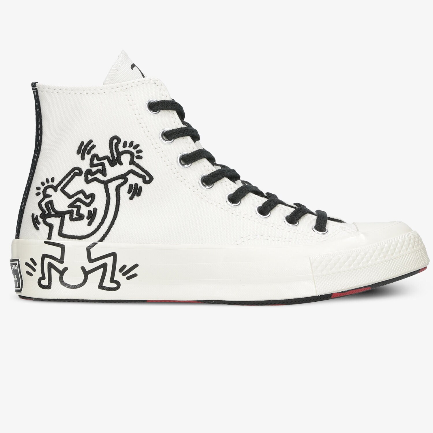 Die Sneaker werden die Aufmerksamkeit eines jeden erregen! Die Kult Grafiken von Keith Haring, die sich auf den leeren Billboarden der New Yorker U-Bahn Stationen präsentieren, erscheinen nun auch auf dem Converse Chuck 70 Modell. Die im Kontrast stehenden Figuren heben sich vor dem Hintergrund des weißen Obermaterials aus organischem Canvas ab, das dank der festen Schnürung den Fuß perfekt hält. Im Innerem befindet sich die Ortholite®Einlegesohle, die für den Komfort und frische Bedingungen sorgt. Die Gummisohle verschafft einen effektiv stabilen Schritt. Auf der Zungenlasche finden wir die Unterschrift des Autors der Ilustration. Das Design umfasst auch ein unverwechselbares Nummernschild im Vintage-Stil.