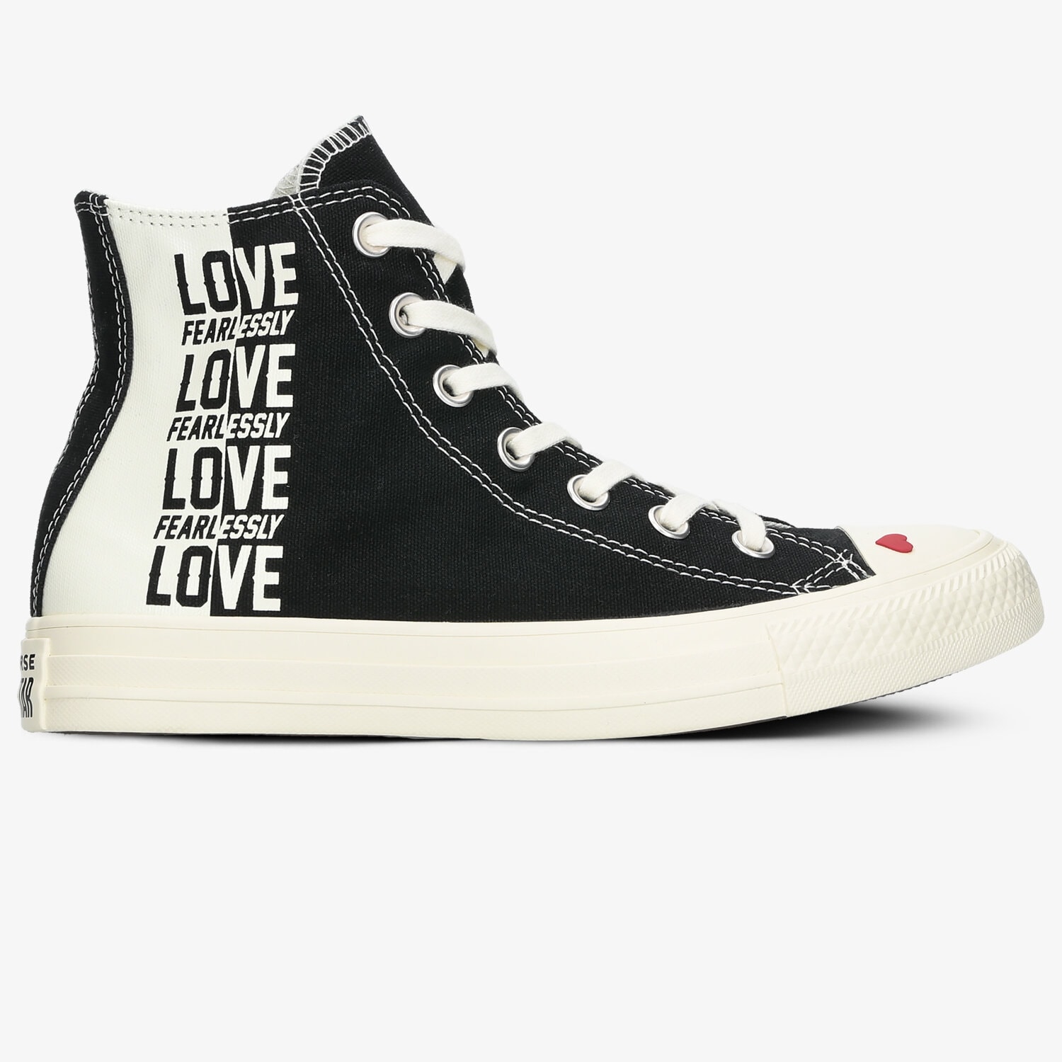 Lasse dich von dem Slogan Love Fearlessly motivieren und erinnere dich an die Bedeutung der Selbstliebe zurück. Diese eben Mission der Rückerinnerung verfolgt die Marke Converse. Die auf ihren kultigen Chuck Taylor All Star thematische Details präsentiert - ein rotes Herz auf dem Shell Toe, sowie der Slogan Love Fearless, der deutlich auf dem High-Top Design zu sehen ist. Das Obermaterial wurde aus einem Canvas mit dichtem Gewebe hergestellt. Außerdem bleibt das Modell seinem obligatorischem, schmalem Schnürsystem treu und die solide Gummisohle, sowie ein Zehenschutz komplettieren das Ganze. Das Branding findest du wie gewohnt auf der Zungenlasche und Ferse.